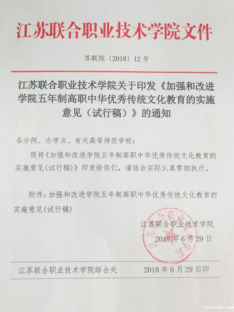 江苏联合职业技术学院关于印发《加强和改进学院五年制高职中华优秀传统文化...